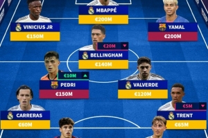 前鋒:維尼修斯(皇馬,1.5億歐)、姆巴佩(皇馬,2億歐)、亞馬爾(巴薩,2億歐 )