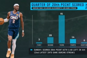 上一場比賽,在第四節還剩1分48秒時拿到第20分(為連續得分紀錄期間,單場拿到20分時間點第二晚的比賽)
