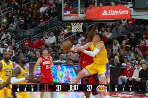GIF-卡佩拉籃下防守拉拉維亞 拉拉維亞拉桿被筐帽 但是裁判認定有身體接觸在先 火箭挑戰失敗