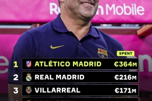 根據數據統計,弗里克上任后,巴薩引援花費僅為8800萬歐,在西甲中位居第5位,落后于馬競(3.64億歐)、皇馬(2.16億歐)、比利亞雷亞爾(1.71億歐)以及貝蒂斯(1.01億歐)。